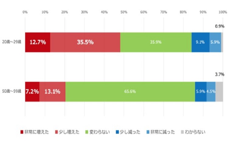 実際に、上司と部下の世代間ギャップも広がりつつあり、コミュニケーションの受け手と話し手では認識に大きなGAPがあることも分かってきました。ある調査では、20代の若手は、50代の上司とのオンライン上のコミュニケーションについて、出社していた時よりも、ストレスを感じるようになった。という認識を持っている方が、50%近いというデータがあります。(画像参照)